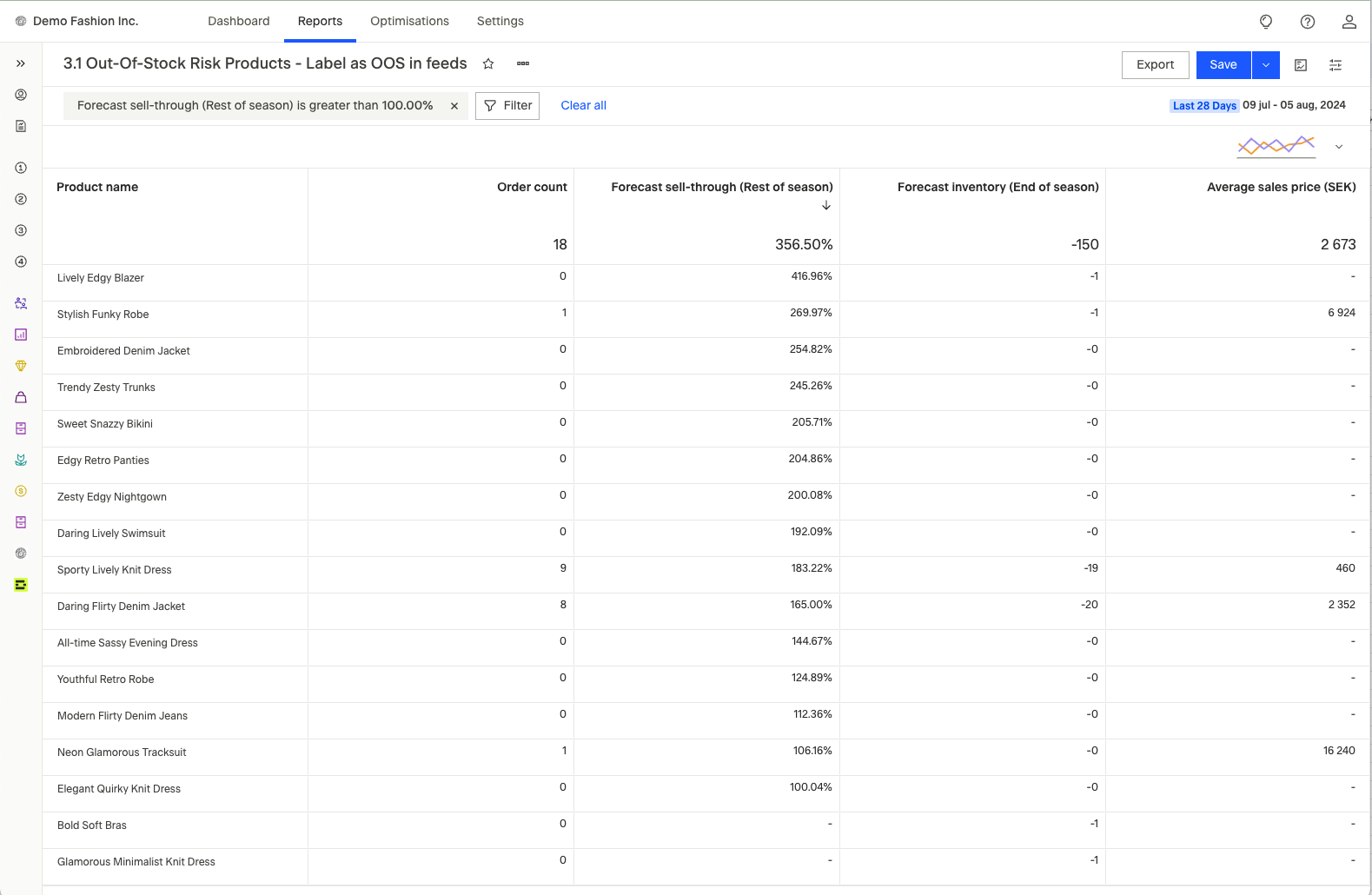 Maintaining a balanced inventory throughout the season requires early and constant control of inventory levels and predicted sell-through rates. By leveraging data-driven insights, you can optimize stock levels and collaborate closely with your buying department, discussing the balance between marketing spend, pricing/discounting, and potential stock replenishments.