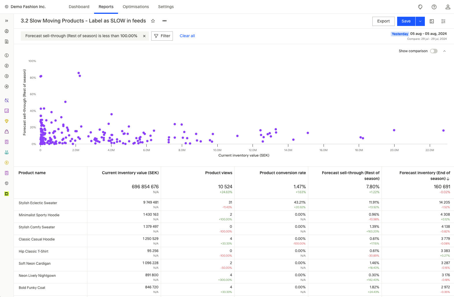 - Analysis: Use Dema’s Inventory Prediction Model to identify products likely to have excess inventory at the end of the season
