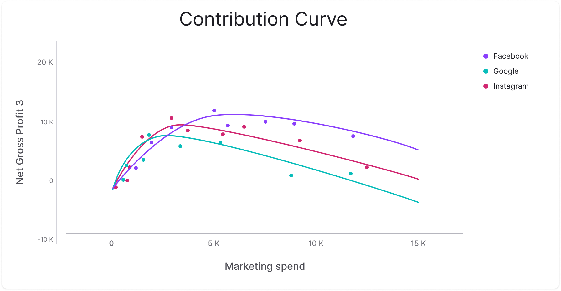 An essential and powerful result of running marketing mix modelling on your marketing spend is that you will understand the marginal gain of your ad spend. "When does a dollar's worth of marketing start to decrease in effect on my sales?" is also possible to plot out for future decision-making in a so-called Contribution Curve, taking both the saturation and the adstock-effect into account (see below).