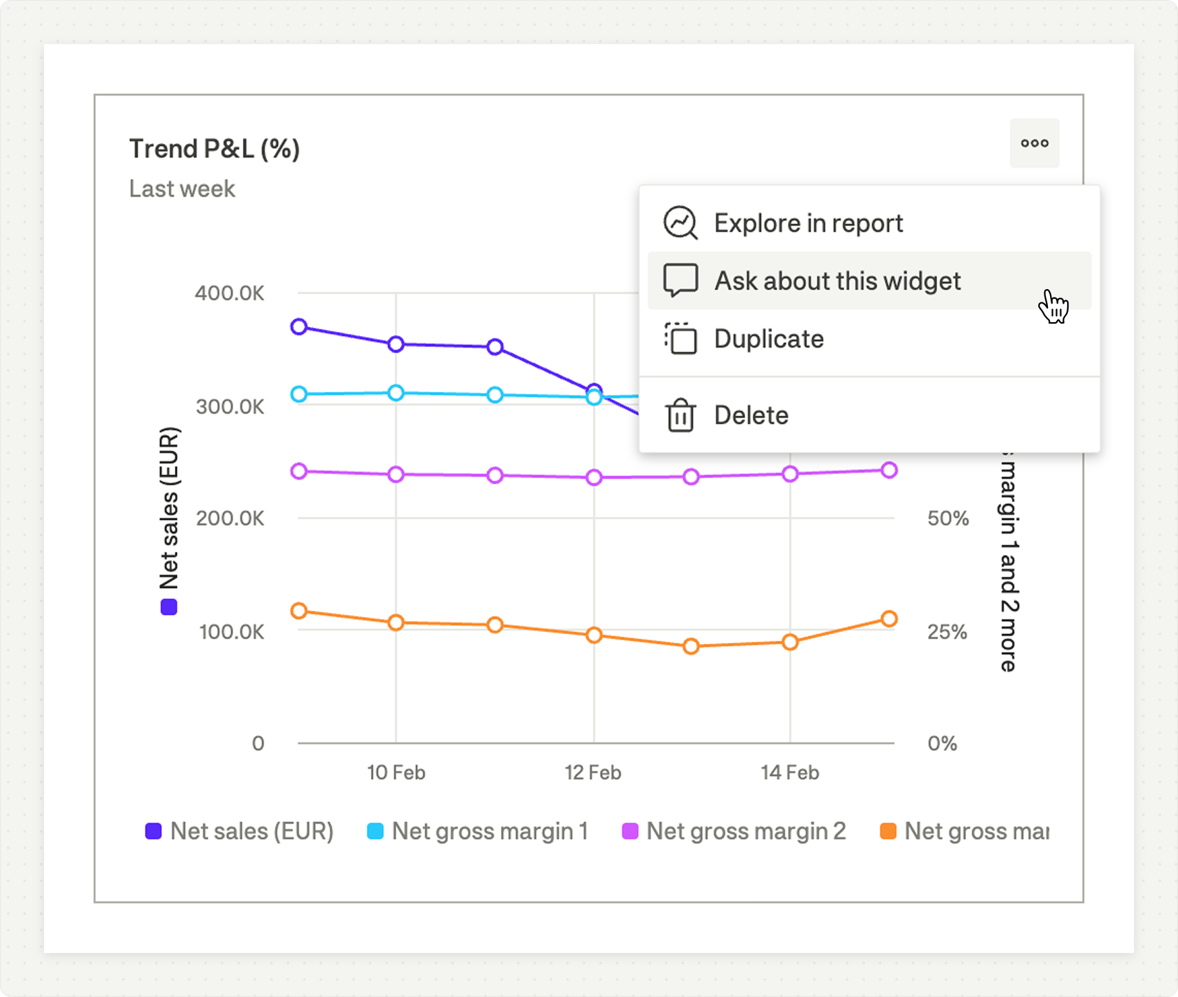 In Dashboards, open the context menu on any chart or table widget and select "Ask about this widget." The Agent receives that specific widget's configuration so it can give you a focused answer.